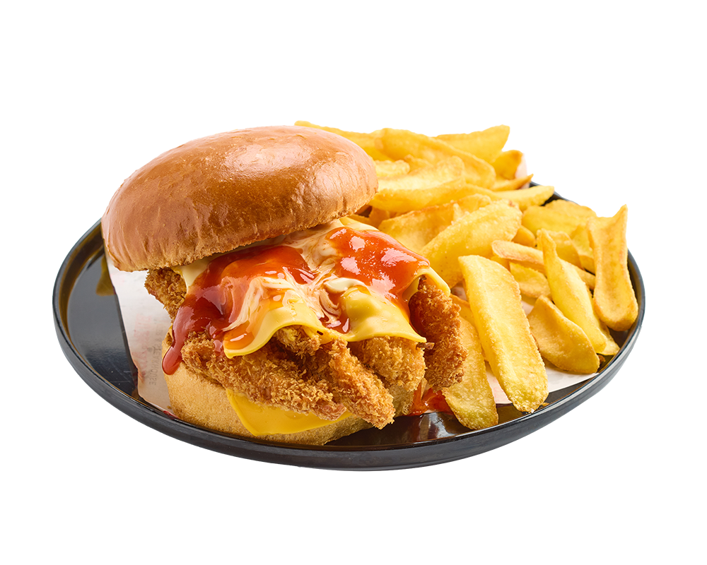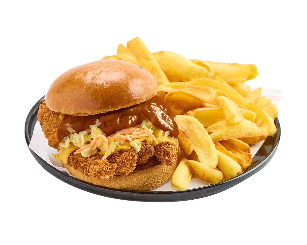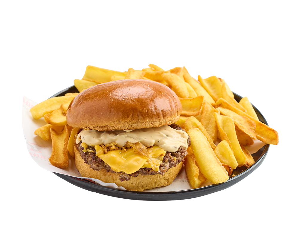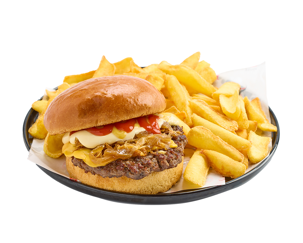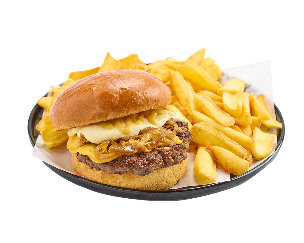120 gr. burger köftesi, cheddar peyniri, karamelize soğan, ballı hardal sos, kıtır soğan, barbekü sos ve patates kızartması ile