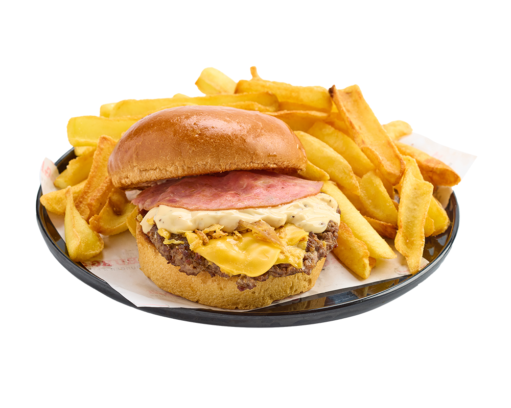 120 gr. burger köftesi, cheddar peyniri, dana füme kaburga, sarımsaklı mayonez, çıtır soğan, kıtır soğan, karamelize soğan. Patates kızartması ile
